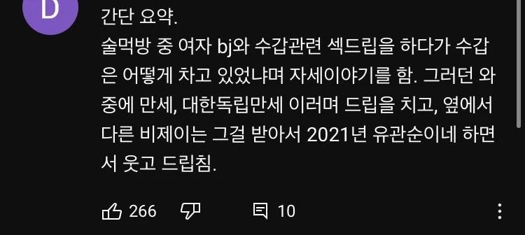 10일 새벽 봉준은 유튜브 채널에 “2021년 5월 10일 새벽 1시경 동료 BJ들과 방송을 진행하던 도중 대한민국 독립운동에 앞장서셨던 유관순 열사에 대한 잘못된 언급과 행동을 하였다”며 사과 영상을 올렸다.