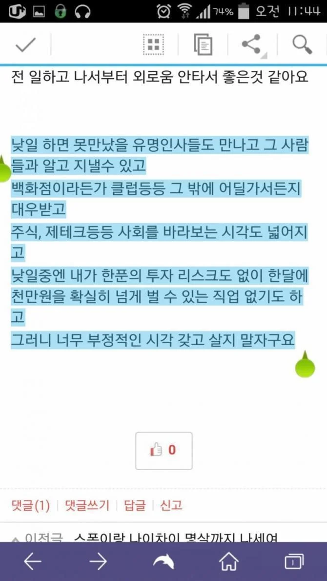 이어 “낮일 중엔 한달에 천만원을 확실히 넘게 벌 수 있는 직업 없기도 하다. 그러니 너무 부정적인 시각 갖고 살지 말자”고 밝혔다.