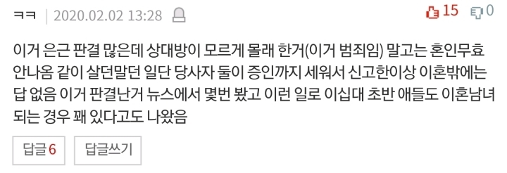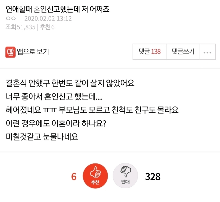글쓴이는 “결혼식 안했고 한번도 같이 살지 않았다. 너무 좋아서 혼인신고 했는데 헤어졌다”고 전했다.