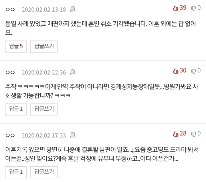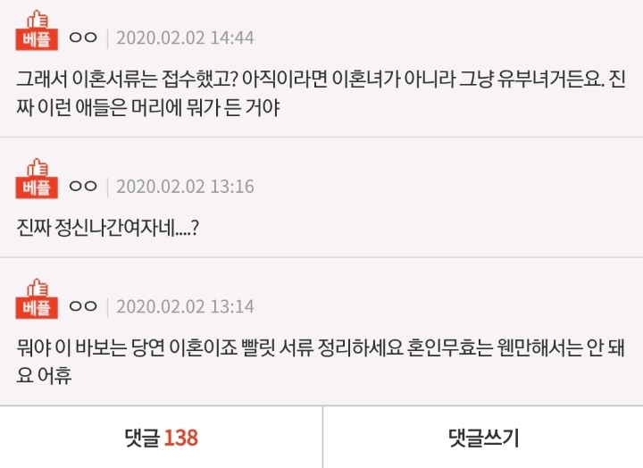 누리꾼들은 “그래서 이혼 접수는 했고? 아직이라면 이혼녀가 아니라 그냥 유부녀다”, “부모님 억장이 진짜 와르르 무너지시겠네요”
