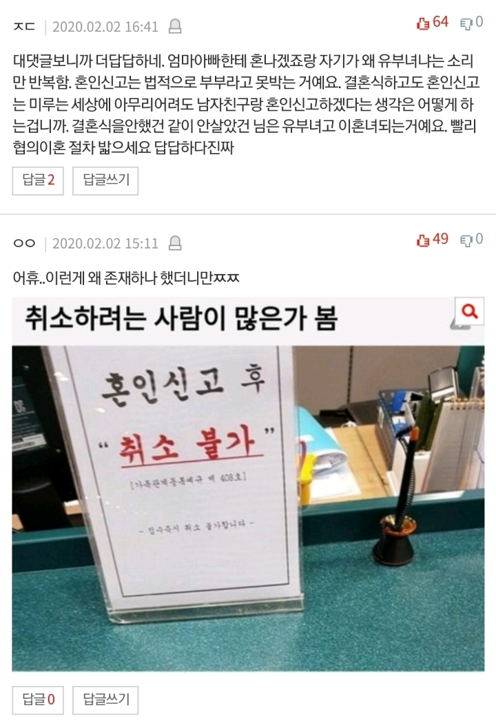 “ 혼인신고 후 취소 불가하다는 팻말이 왜 존재하나 했더니ㅉㅉ” “벌써 이혼낙인 찍혀버렸네…” “생각이란게 있는 건가요?” “이혼 기록 있으면 나중에 결혼할 때도 다 나오는건데 ㅋㅋㅋ 어떻게 말하려고…?” 등의 반응을 보였다.