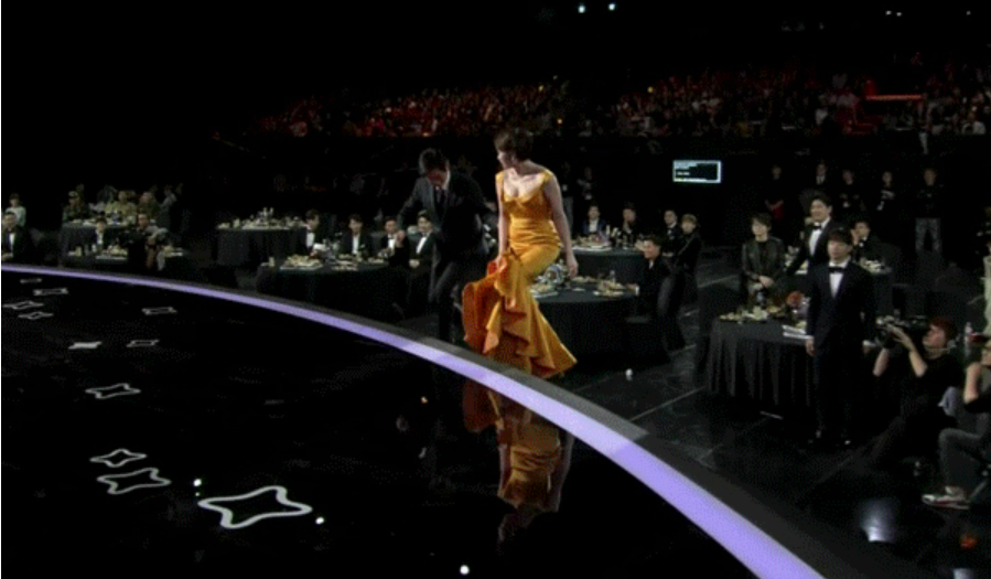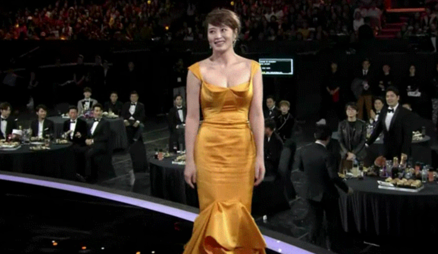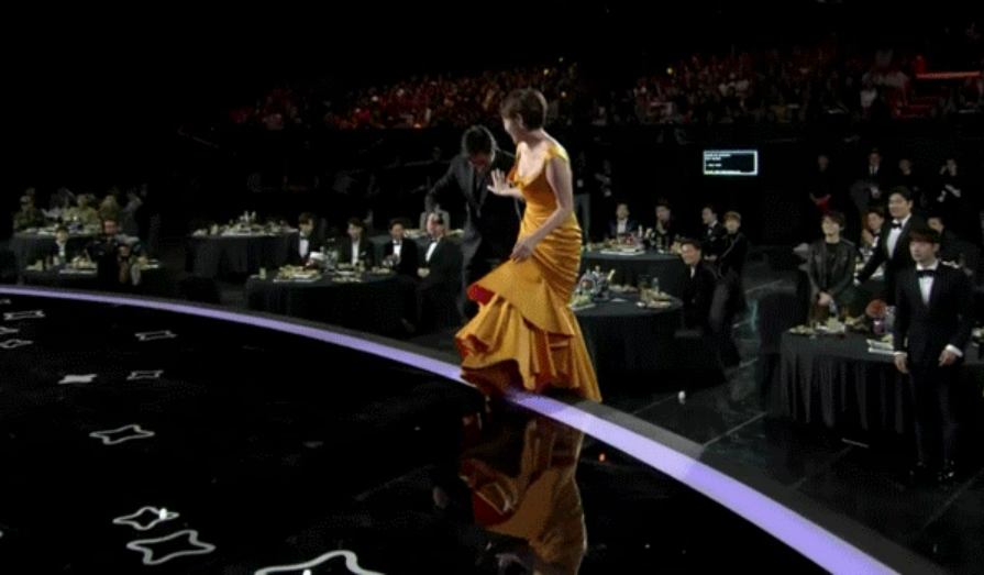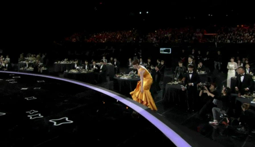 배우 김원해가 무대 옆으로 와 그를 부축하자 김혜수는 괜찮다는 의미로 손짓했다. 김혜수는 드레스를 정리하고 무대 위로 올라갔다.