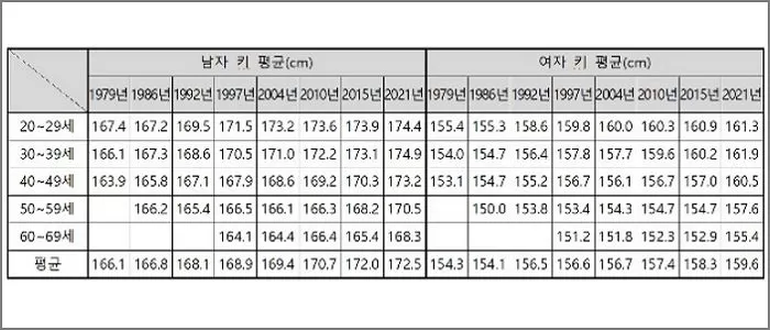 직전 조사만 하더라도 평균 키가 0.5cm, 1.3cm가 증가했고, 과거 1979년 1차 조사 때와 비교하면 무려 남성의 키는 6.4cm, 여성은 5.3cm가 커졌다.