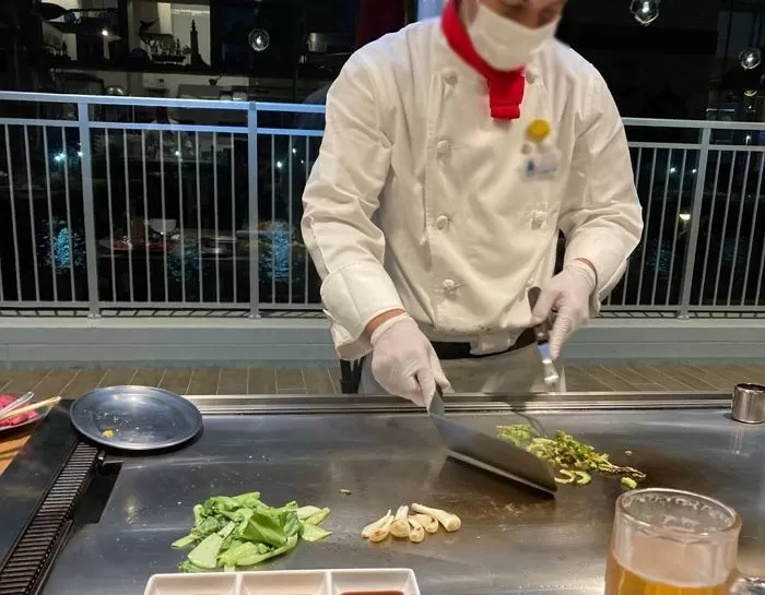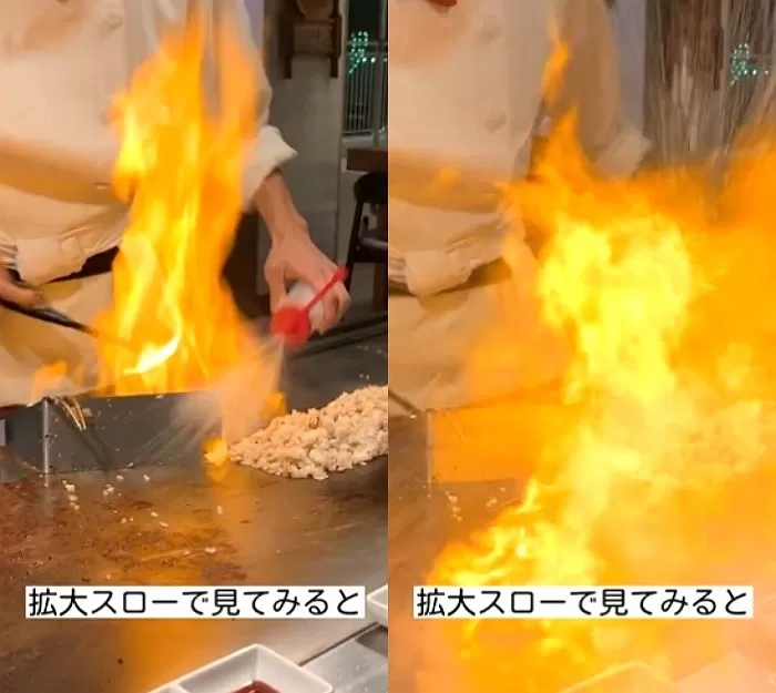고기를 굽던 요리사가 철판 위에 술을 뿌리자마자 갑자기 불길이 일직선으로 카메라를 향해 온다.