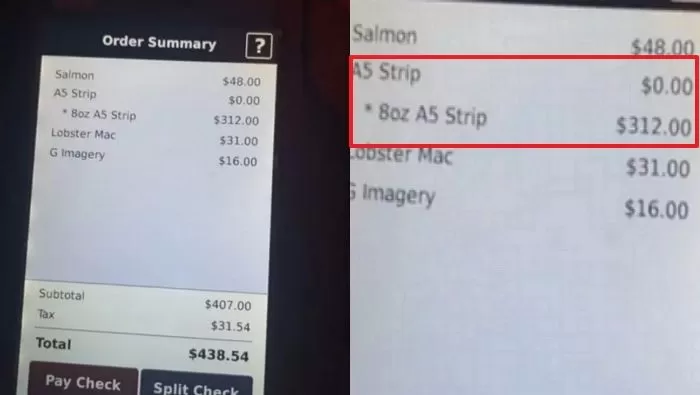 문제는 와규 스테이크였는데, 다니엘라는 실수로 와규 가운데서도 최상급으로 꼽히는 ‘A5’ 등급 스트립 스테이크 8oz 사이즈를 시켰고 이는 312달러(한화 약 32만 3,100원)였다.