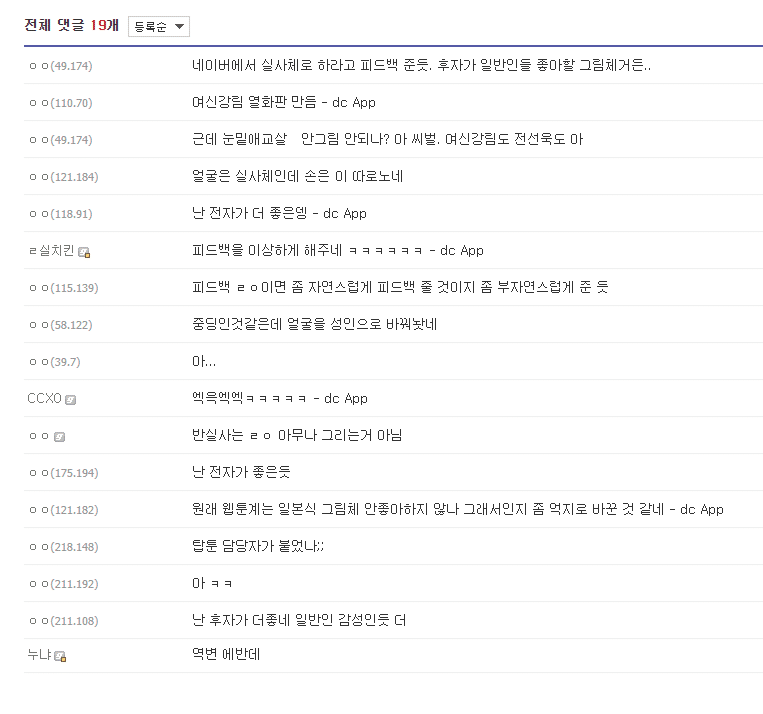 반면 “난 후자가 더 좋다. 더 일반인 감성인 것같다”, “네이버에서 실사체로 하라고 피드백 준듯. 후자가 일반인들이 좋아할 그림체다” 등의 의견을 보이는 누리꾼도 있었다.