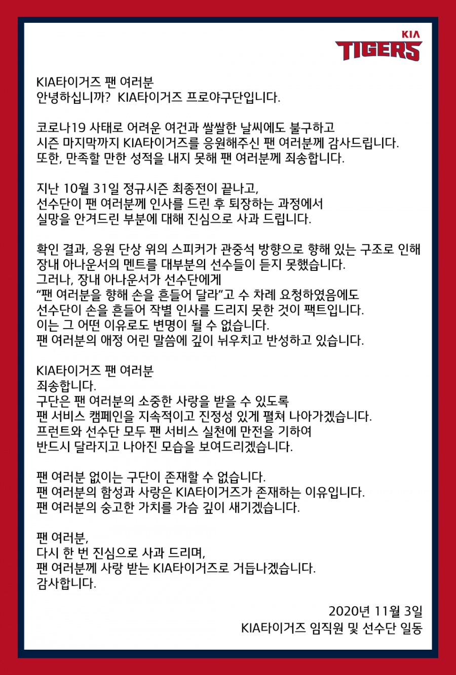 3일 기아 타이거즈는 구단 공식 홈페이지를 통해 임직원 및 선수단 일동 명의로 사과문을 게재했다.
