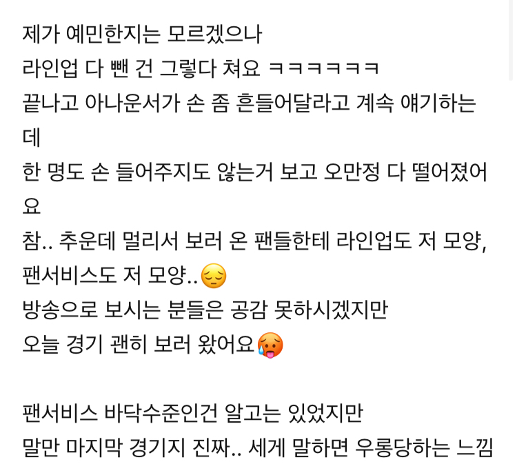 이어 “선수단이 손을 흔들어 작별 인사를 드리지 못한 것이 팩트다. 이는 그 어떤 이유로도 변명이 될 수 없다. 팬 여러분의 애정 어린 말씀에 깊이 뉘우치고 반성하고 있다”고 사과했다.