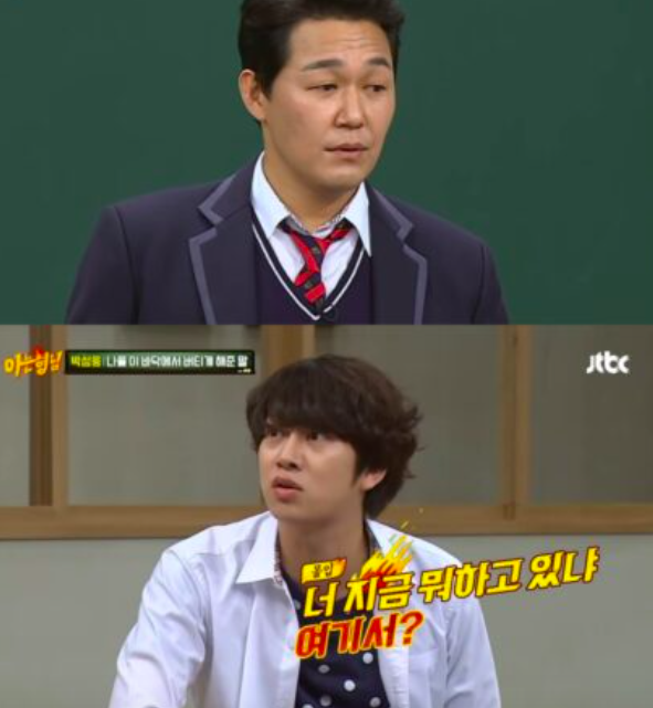 박성웅의 표정이 순간 굳었는데, 김희철은 계속해서 “너 지금 뭐하고 있냐, 여기서?”라고 소리를 쳤다.