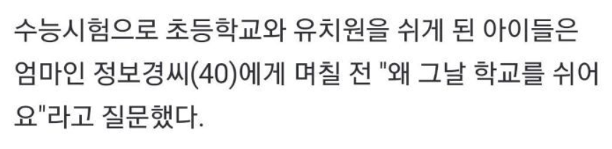 A씨는 “수능시험으로 초등학교와 유치원을 쉬게 된 아이들은” 라 말문을 열었다.