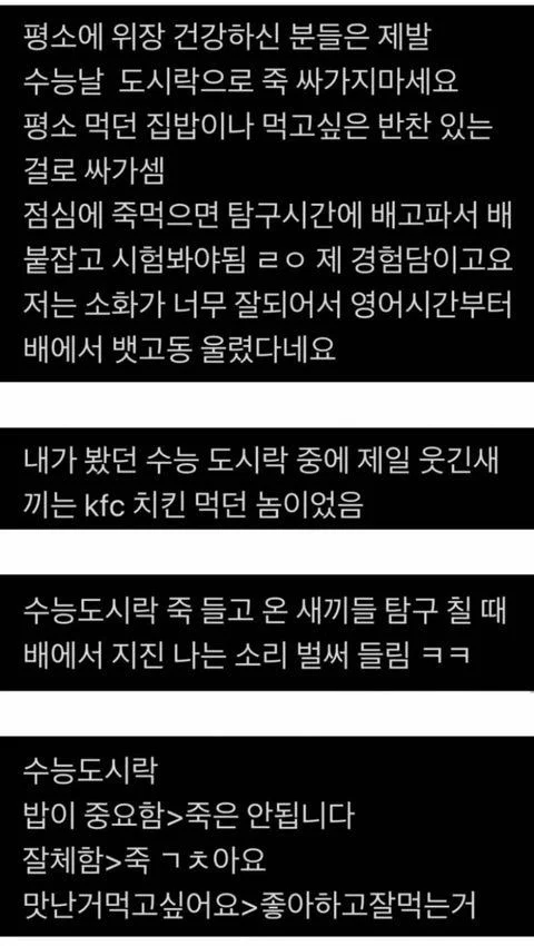 트위터 이용자 A씨는 “평소에 위장 겅간하신 분들은 제발 수능날 도시락으로 죽 싸가지 말라”고 조언했다.