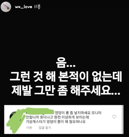 “가슴이랑 엉덩이 너무 과하게 넣음 극혐” “엉덩이 뽕 좀 넣지마세요 모니터 안합니까 표다나고 완전 이상하게 보이는데 기상캐스터가 엉덩이 뽕이 왜 필요하나요” “본인이 예쁘다고 생각하나 하나도 안이쁨 퉤 돼지같이생김”
