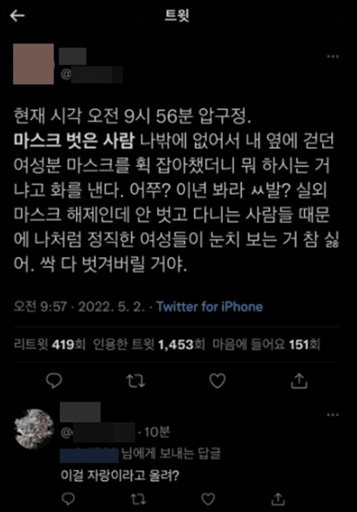 이어 “어쭈? 이X 봐라 X발? 실외 마스크 해제인데 안 벗고 다니는 사람들 때문에 나처럼 정직한 여성들이 눈치 보는 거 참 싫어. 싹 다 벗겨버릴 거야“라고 말했다.
