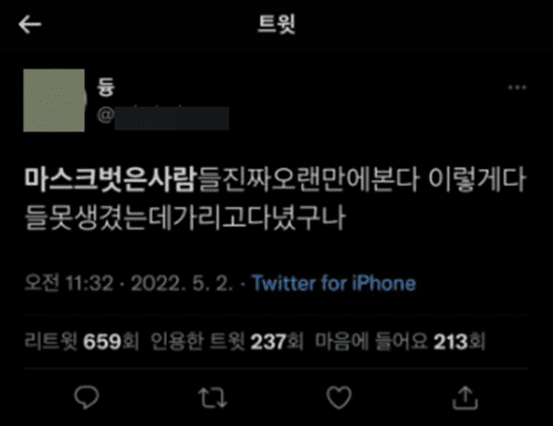 한편, 실외 마스크 착용 의무화가 해제되면서, 각종 온라인 커뮤니티에는 “마스크 벗은 사람들 진짜 오랜만에 본다”, “이렇게 다들 못생겼는데 가리고 다녔구나”, “내 주변엔 아무도 안 벗고 다니던데” 등 마스크와 관련된 글들이 대거 올라오고 있다.