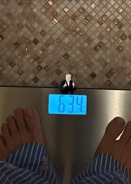 성공적으로 다이어트를 하고 있다는 듯, 뷔는 자신의 몸무게 위에 손가락을 치켜세운 이모티콘을 붙이기도 했으며 함께 올린 스토리에는 상의를 탈의한 듯한 사진도 있었다.