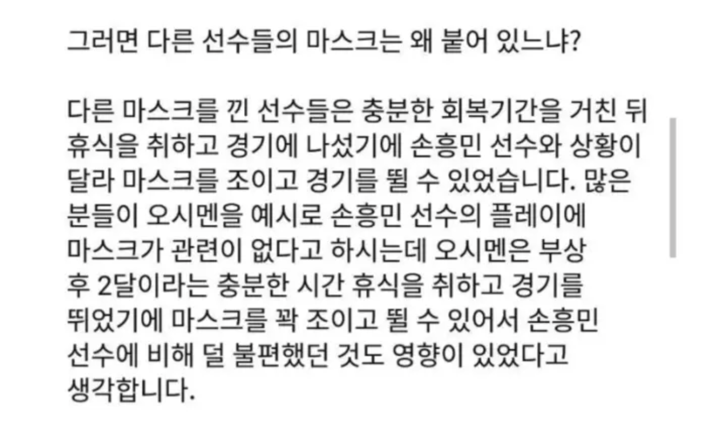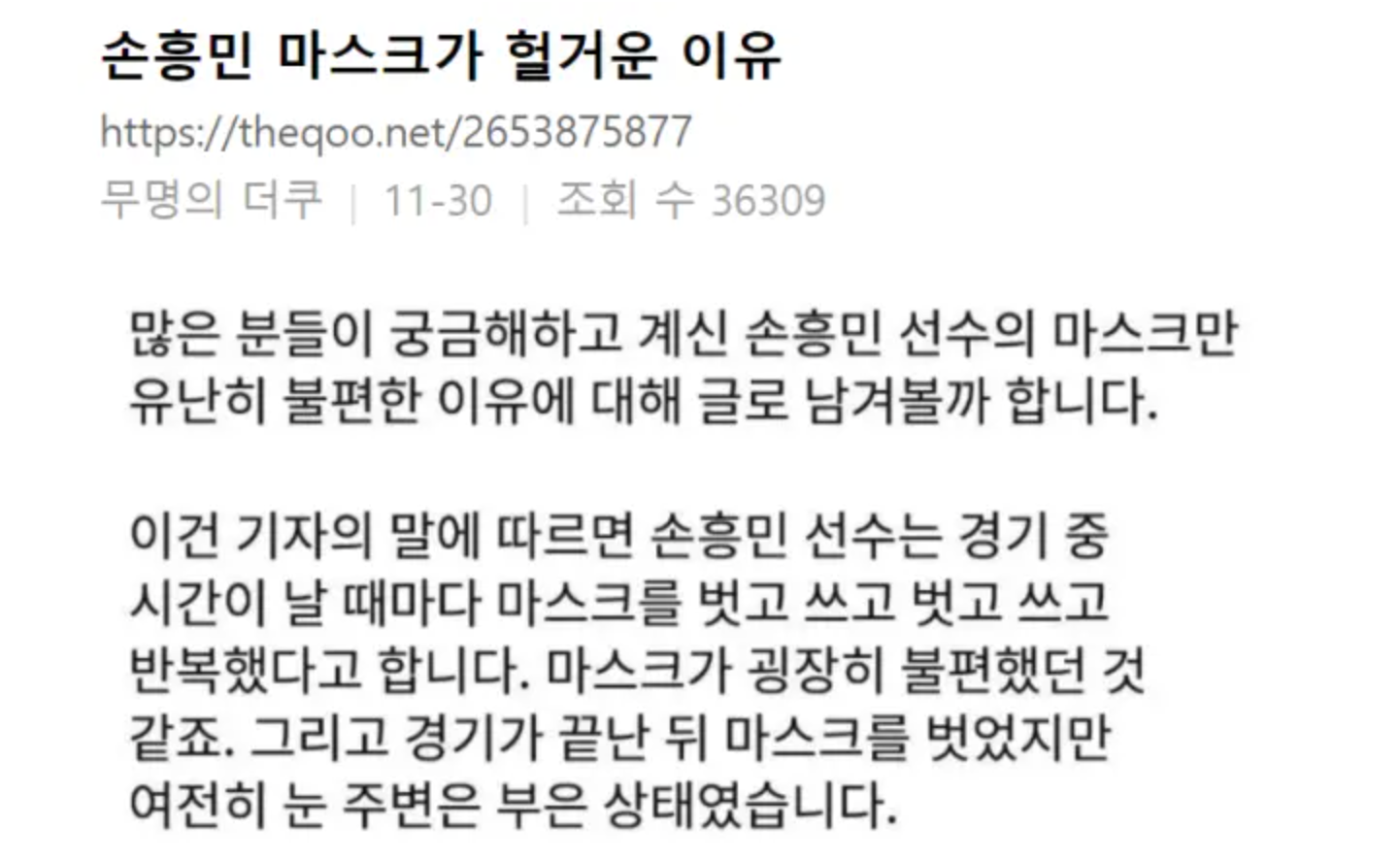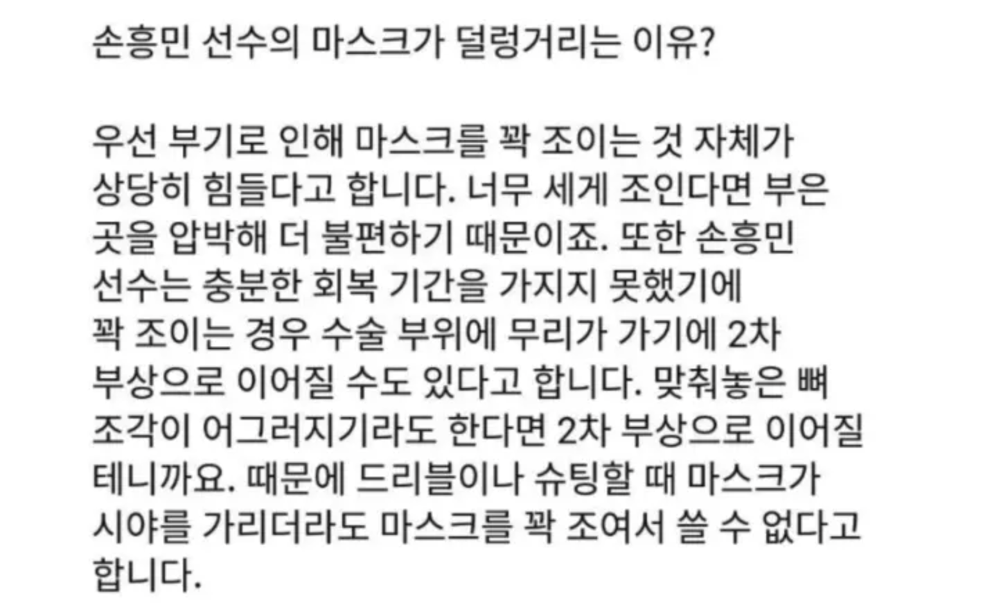 온라인 커뮤니티에는 “손흥민 마스크가 헐거운 이유”라는 제목의 글이 올라와 누리꾼들 사이에서 엄청나게 화제가 되고 있다.