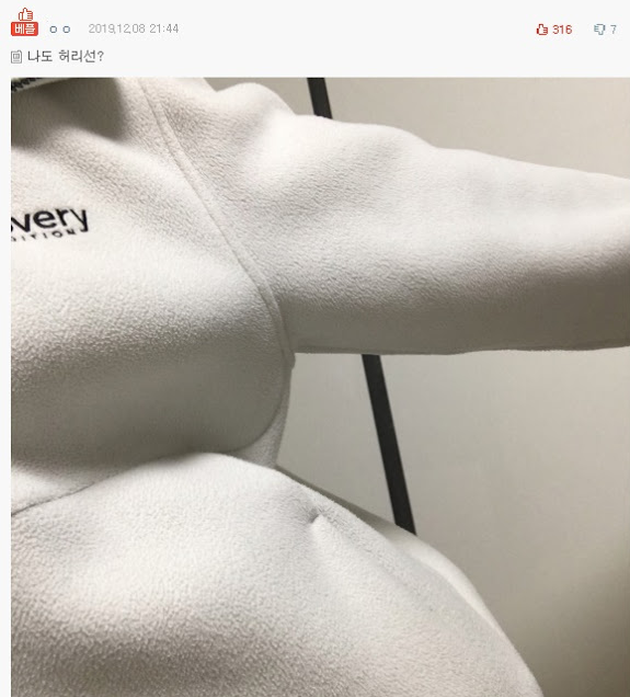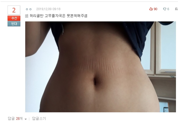 밴딩바지를 입고 있었는지 배에 고무줄 자국이 선명하다.