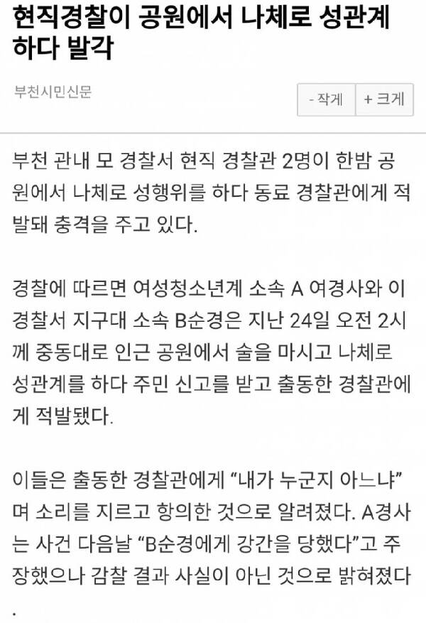 부천 관내 모 경찰서 현직 경찰관 2명이 야심한 밤 공원에서 둘다 나.체 상태로 야스를 하다 시민들에게 신고를 당했다.