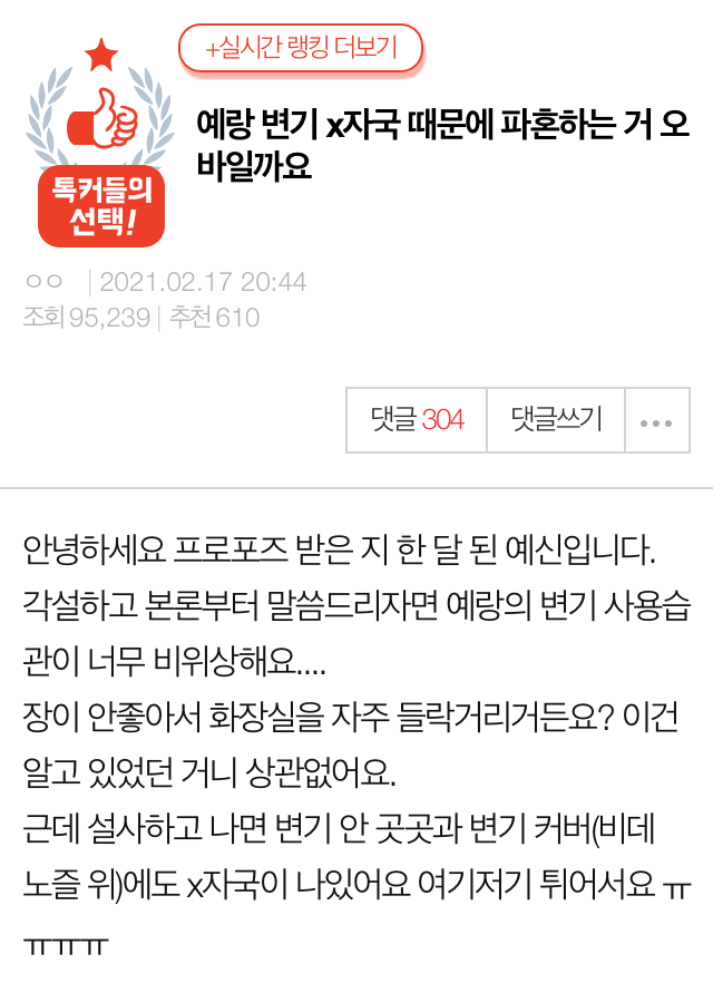 지난 17일 네이트판에는 ‘예랑 변기 X자국 때문에 파혼하는 거 오바일까요’라는 제목의 글이 올라왔다.