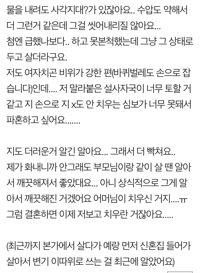 누리꾼들은 “진짜 비위 상한다”, “나도 신혼여행 때 남편 더러운 거 알아서 그 다음부턴 그냥 화장실 따로 씀”, “남자는 여자가 아닌 새엄마랑 결혼하려는 거네” 등의 반응을 보였다.
