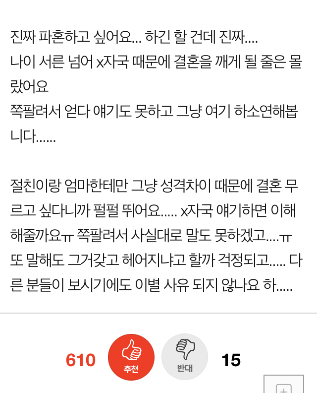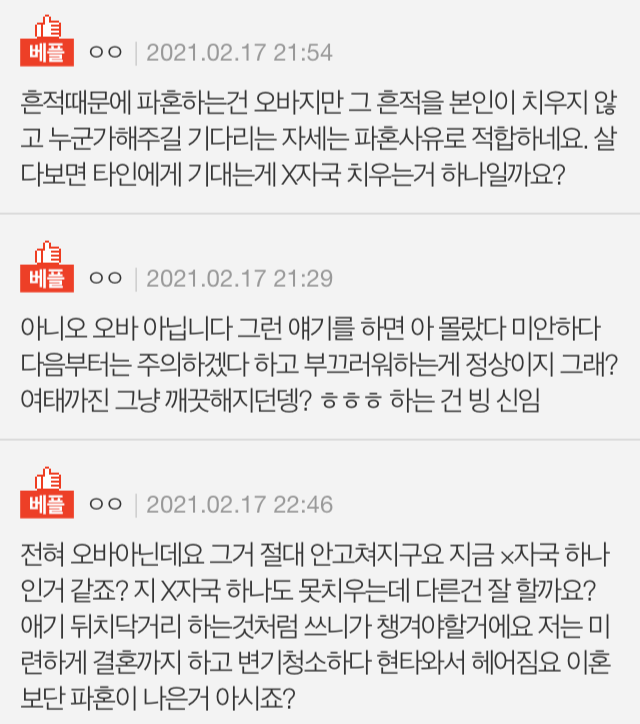 이어 “진짜 파혼하고 싶다. 나이 서른 넘어 X자국 때문에 결혼을 깨게 될 줄은 몰랐다. 다른 분들이 보시기에도 이별 사유가 되지 않냐’고 하소연했다.