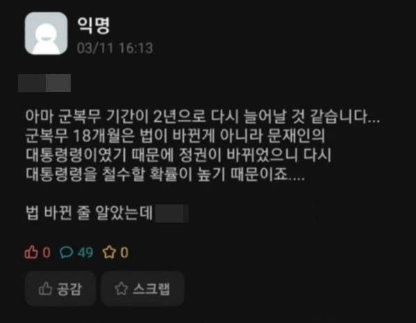 대선이 끝난 후 온라인커뮤니티와 소셜미디어에서 군 복무기간 관련 글들이 화제가 되고 있다.