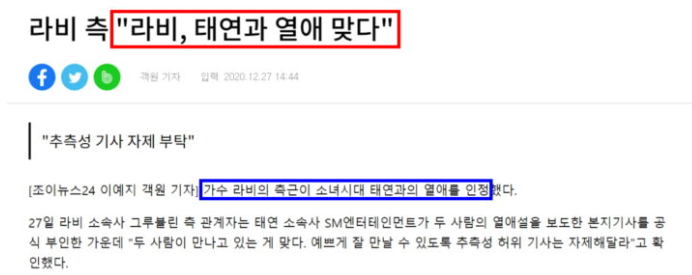하지만 태연 측에서 먼저 나서서 라비와 ”친한 선후배 사이”라며 열애설을 완강히 부인했다.