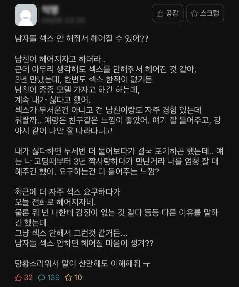 해당 게시물에 따르면 “아무리 생각해도 관계를 안해줘서 헤어진 것 같아. 3년을 만났는데 한 번도 한 적이 없거든”이라고 글을 시작했다.