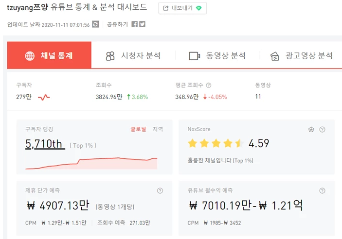 그가 공개한 녹스인플루언서(유튜브 채널 분석 사이트)에 따르면 ‘욕지도’ 편의 영상 한 개 당 예상 수익은 대략 1억 원 정도라고 추정했다.