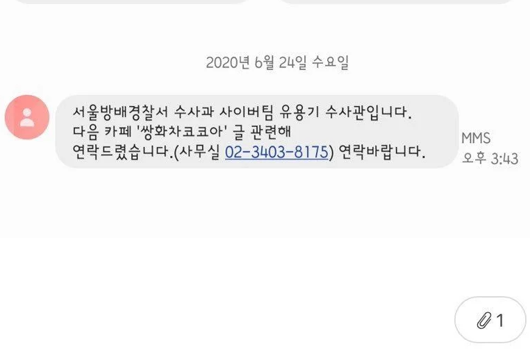 이에 악플을 단 여초카페 회원들은 자신들이 경찰에게 온 문자 등을 업로드하면서 인증하기 시작했다.