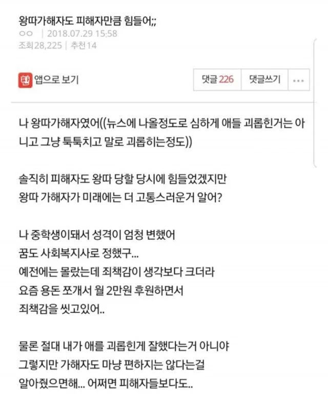 작성자 A씨는 “난 왕따가해자였는데 뉴스에 나올 정도로 심하게 괴롭힌 건 아니고 그냥 툭툭치고 말로 괴롭히는 정도였다”고 말문을 열었다.