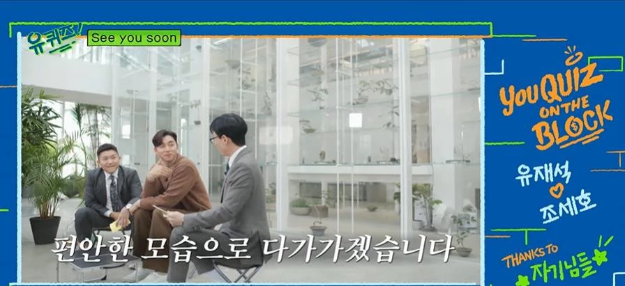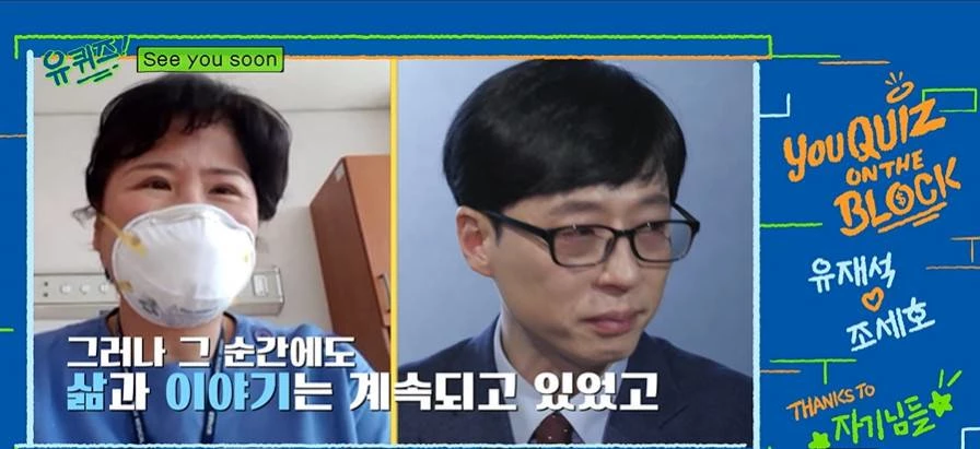 자막에는 “조금은 어색했던 지붕 아래 토크, 그러나 그 순간에도 삶과 이야기는 계속되고 있었고 어두울 줄 알았던 우리의 지붕 아래는 많은 사랑 덕에 햇살로 가득했다”면서 “앞으로도 ‘유퀴즈’는 조명이 비쳐야 할 곳을 찾아 속 시원하고 편안한 모습으로 다가가겠다.