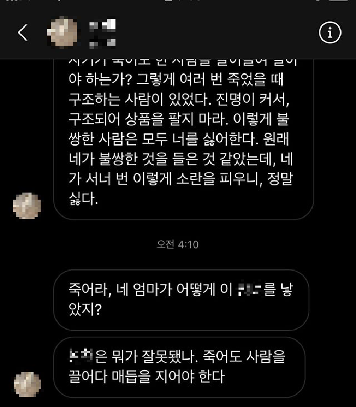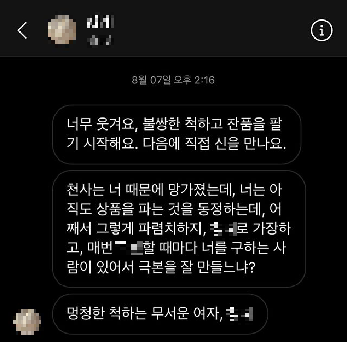 악성 DM을 보낸 악플러 A씨는 “천사는 너 때문에 망가졌는데 너는 아직도 상품을 파는 것을 동정하지, 어째서 그렇게 파렴치하냐”며 비난했다.