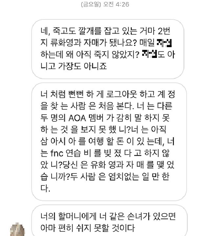 A씨는 “죽어라, 네 엄마가 어떻게 이 XX를 낳았지? 죽어도 사람을 끌어다 매듭을 지어야 한다”며 욕설을 퍼부었다. 또한 “OO은 뭐가 잘못됐냐”며 다른 AOA멤버들을 언급하기도 했다.