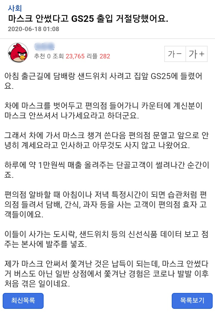 18일 한 온라인 커뮤니티엔 ‘마스크 안썼다고 GS25 출입 거절 당했어요’란 제목의 글이 올라왔다.
