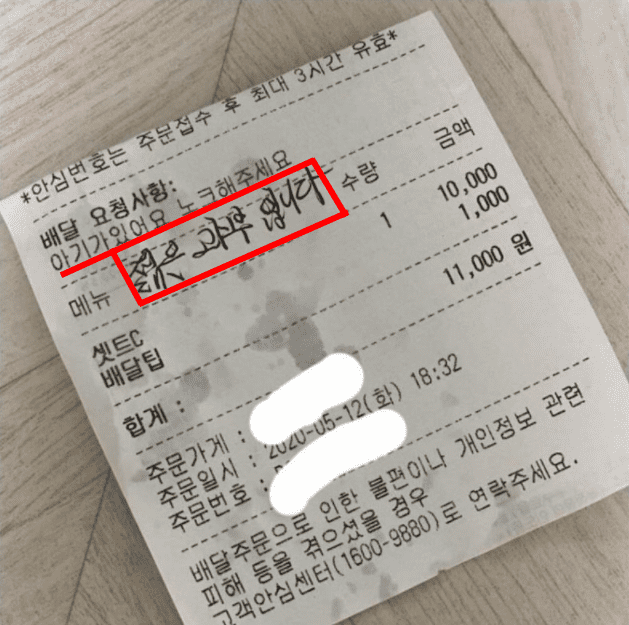 고객은 배달 요청사항에 “아기가 있어요 노크해주세요”라고 요청했다.