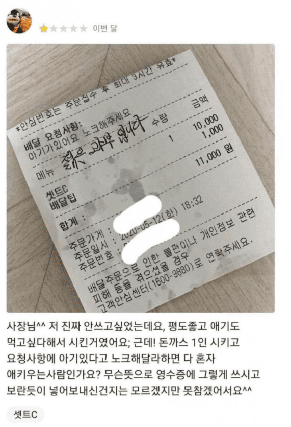 A씨는 “사장님 저 진짜 리뷰 안쓰고 싶었는데 돈까스 1인 시키고 요청사항에 아기있다고 노크해달라하면 다 혼자 애 키우는 사람인가요?”라며 “무슨 뜻으로 영수증에 그렇게 쓰시고 보란 듯이 넣어보내신건지는 모르겠지만 못 참겠다”고 전했다.