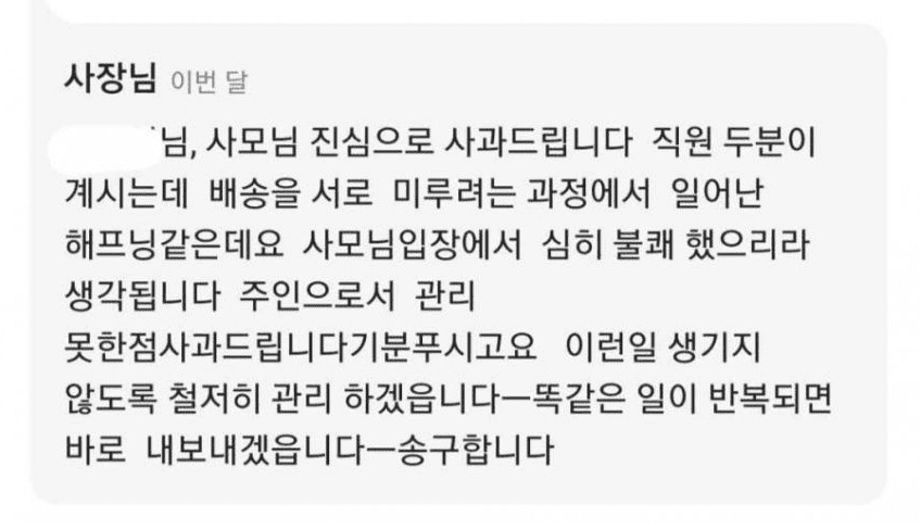 이를 접한 누리꾼은 “이거 누가봐도 사장이 직접 써놓고 그냥 책임전가한거 같은데;; 말투 진짜 개더러움” 의 반응을 보였다.