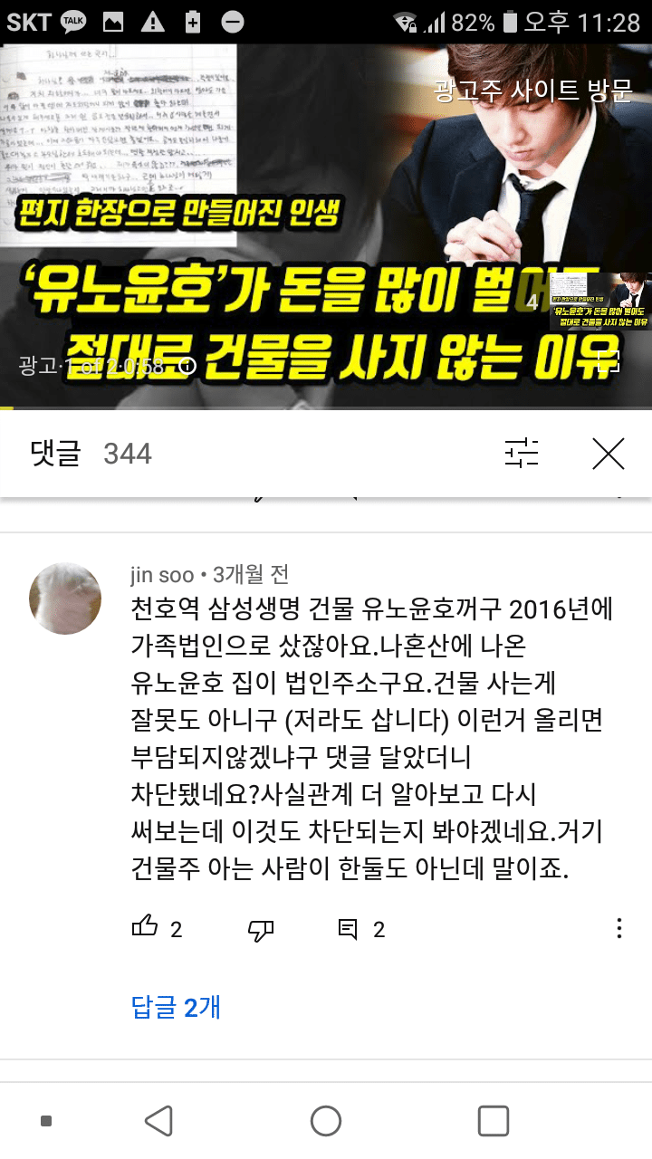 게시글 작성자 A씨는 유노윤호가 천호역 삼성생명 건물을 가족법인으로 샀다고 제보했다.